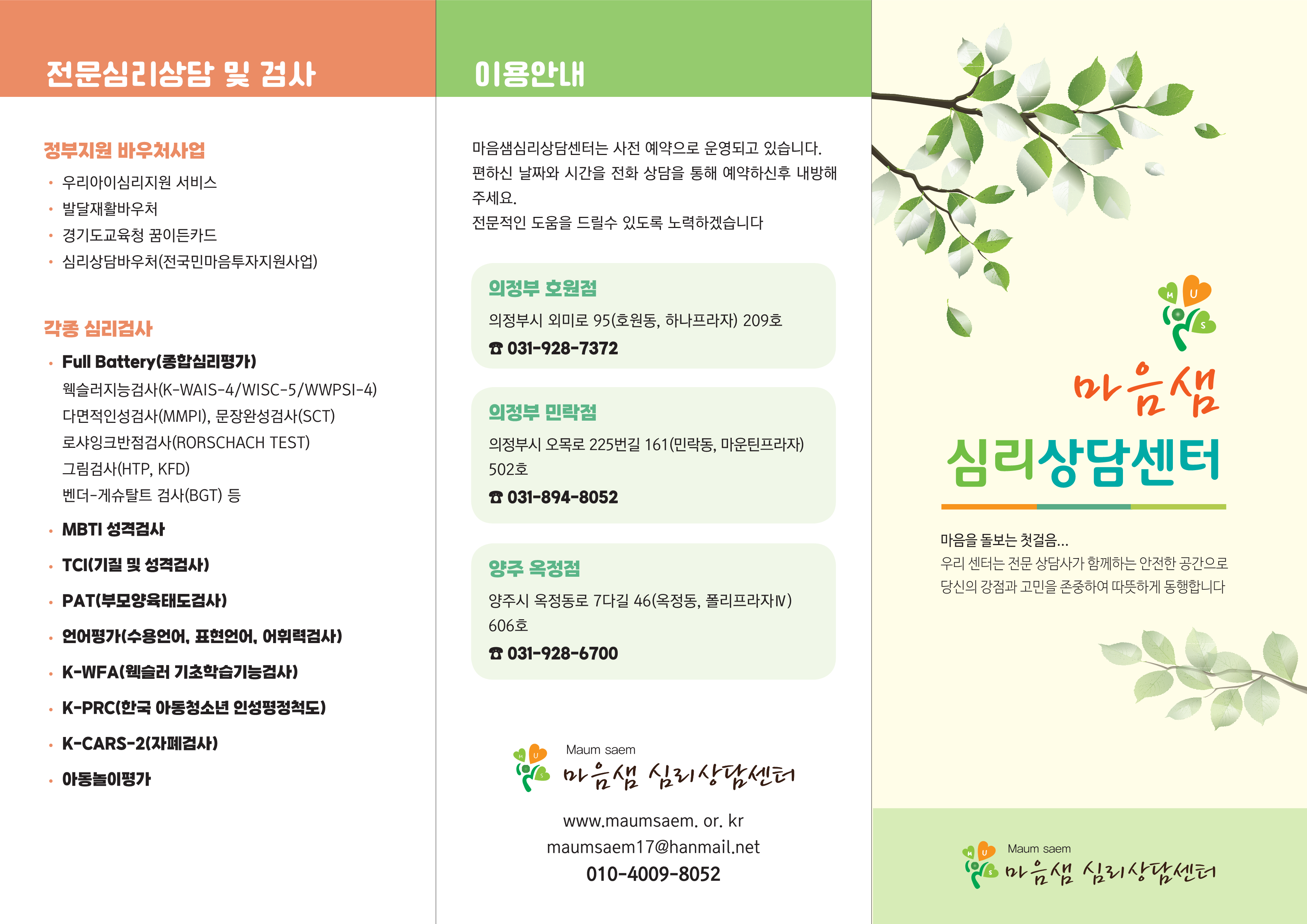 마음샘심리상담센터는 그동안 의정부 민락점과 호원점에서 전문 심리상담서비스를 제공해 왔습니다